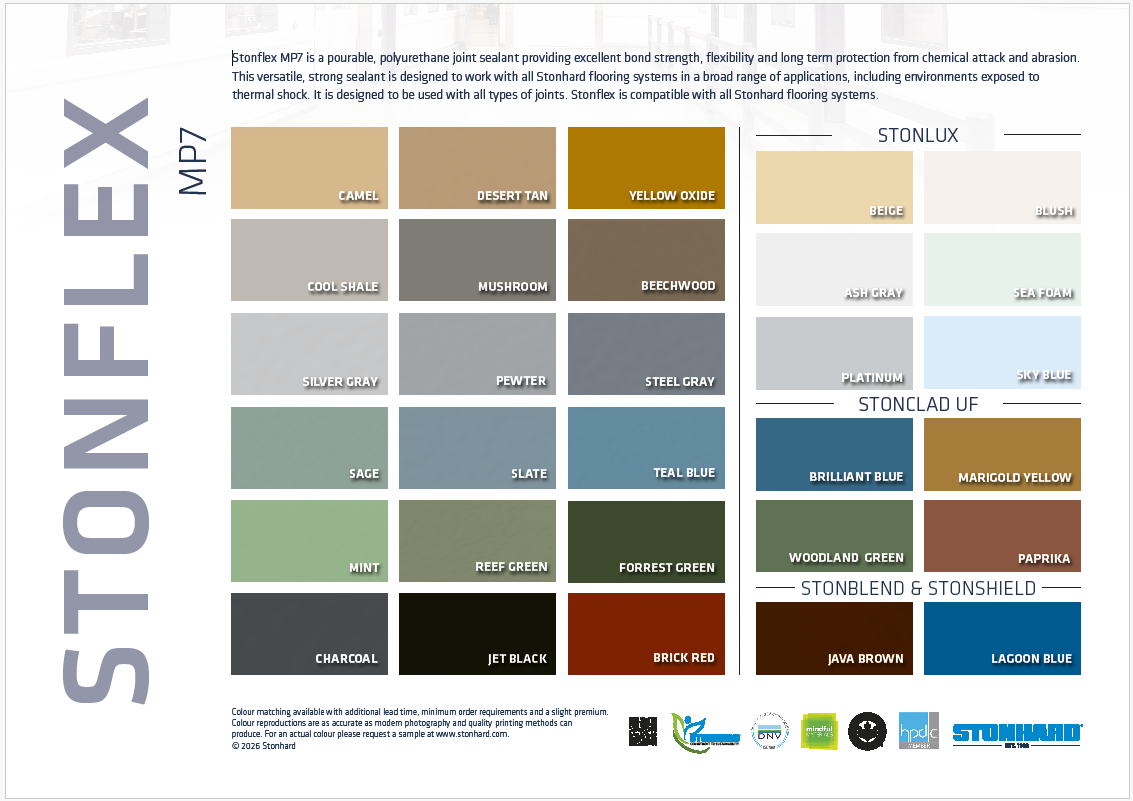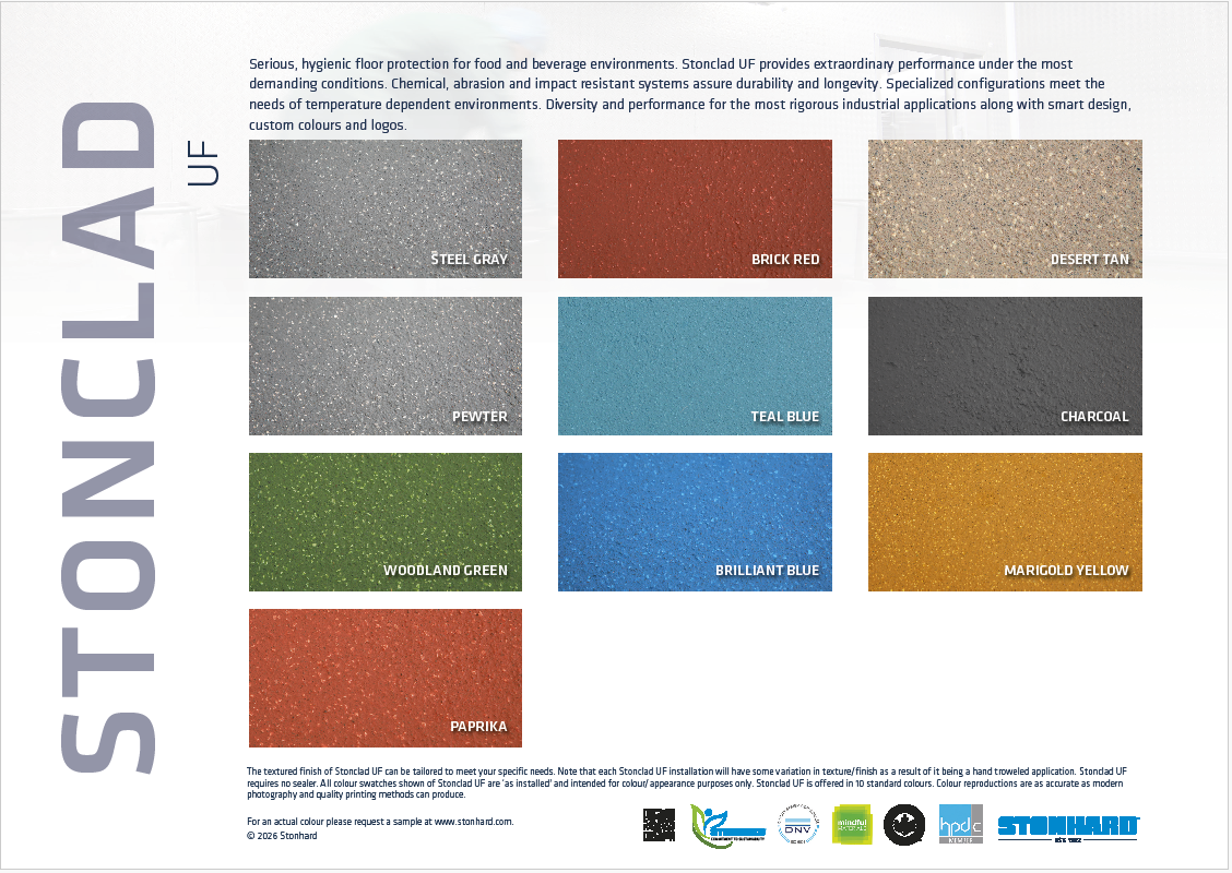 Stonhard propose une large gamme de coloris standard, qu’il s’agisse de teintes bleues et grises fraîches et claires ou de tons de rouge chauds et terreux, voire soutenus. De même, il existe des surfaces texturées et des combinaisons de coloris pour dynamiser l’esthétique des surfaces industrielles ou commerciales. Mat, brillant, à motifs ou monochrome. Demandez notre gamme de coloris exclusive, ou des couleurs et logos personnalisés.